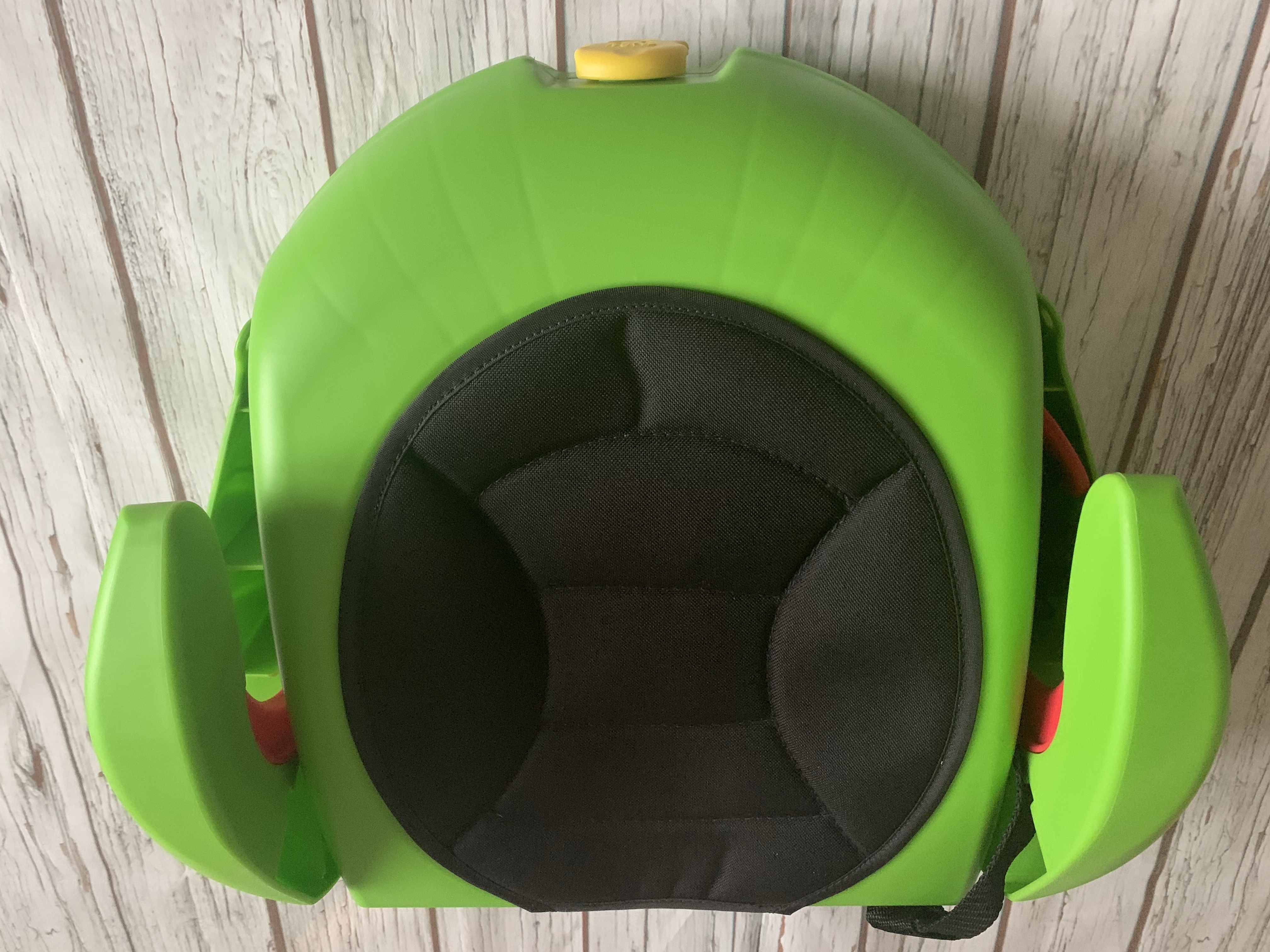 The seat has a removable padded cushion that can easily be cleaned in the washing machine (always a bonus!) It also has side arm rests for extra comfort that lift up by simply pressing the yellow button in the middle of the wheels.