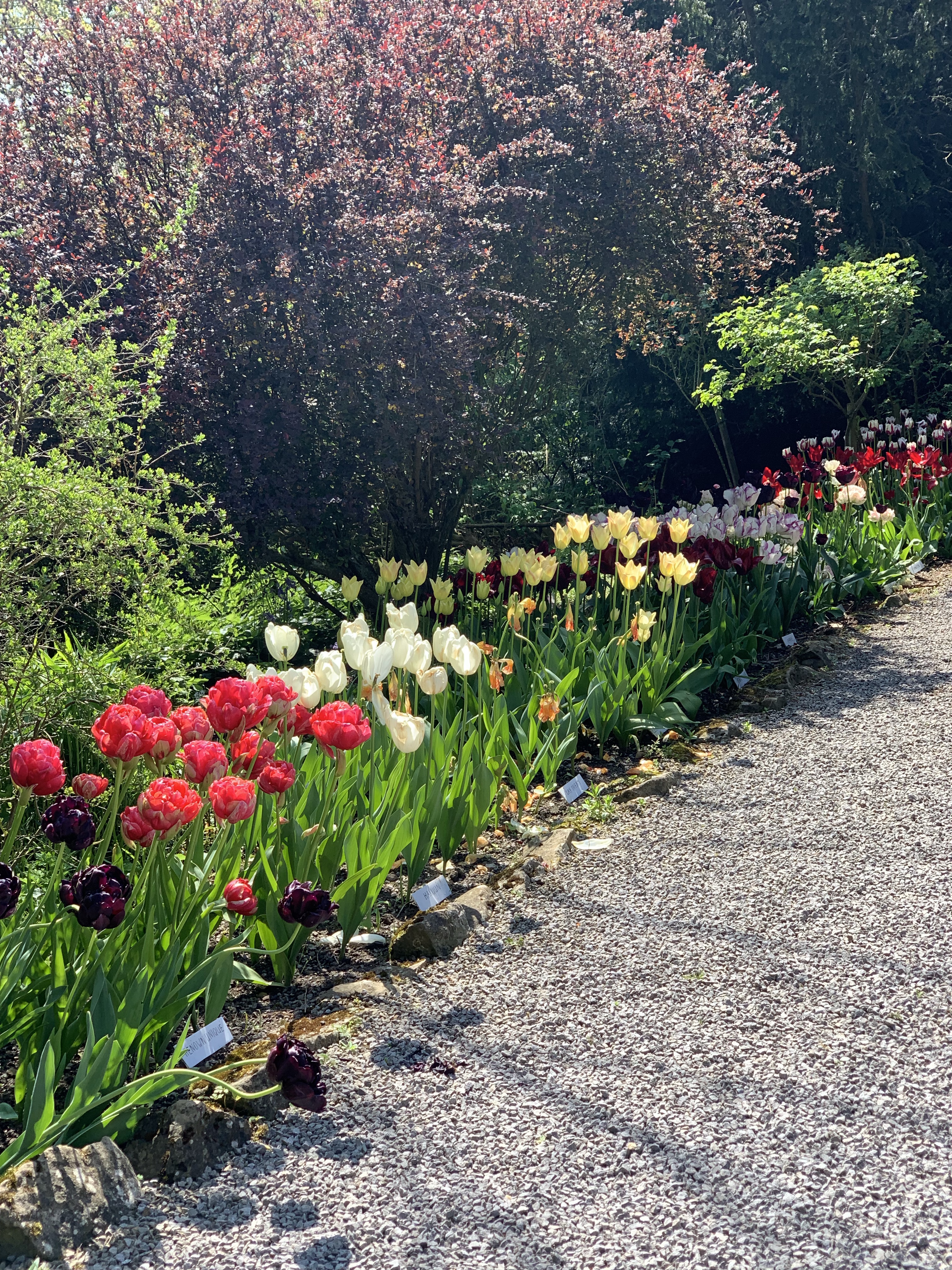 The gardens are also show gardens for tulips, with 60-70 varieties and maybe 60,000 tulips. I didn’t expect there to be such a wonderful display of flowers as well as the fairies! The tulips are all labelled, as are the impressive trees and shrubs, not sure I have seen a climbing plant whose leaves turn pink in the summer before!