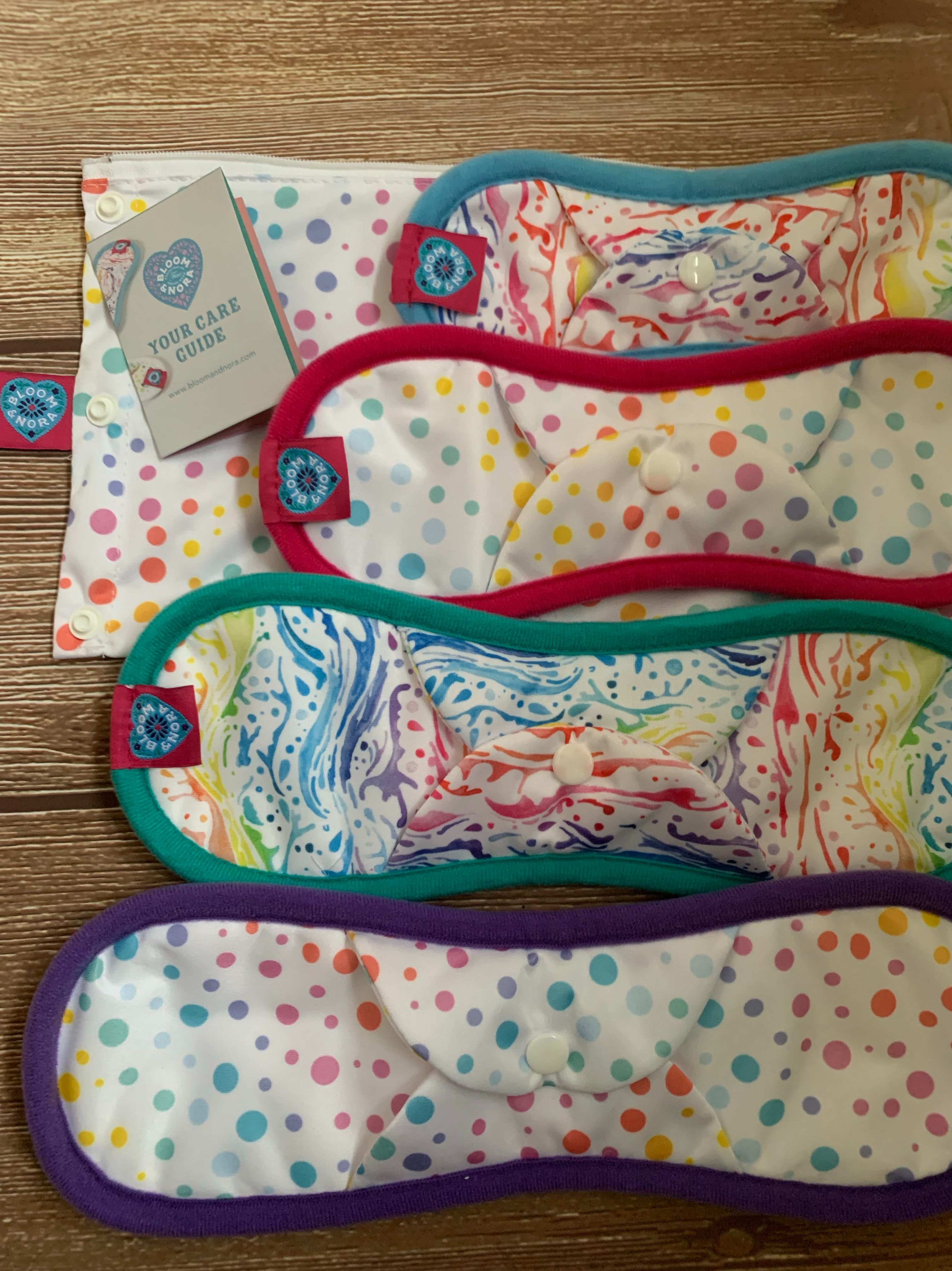 Bloom & Nora came about from the owners of TotsBots reusable nappies who were inspired to make environment and body friendly, sanitary products. This Watercolour Rainbow kit comes in a pretty, colourful and discrete Dotty Out & About bag, the bag is waterproof and cleverly split into two sections for used and unused pads.