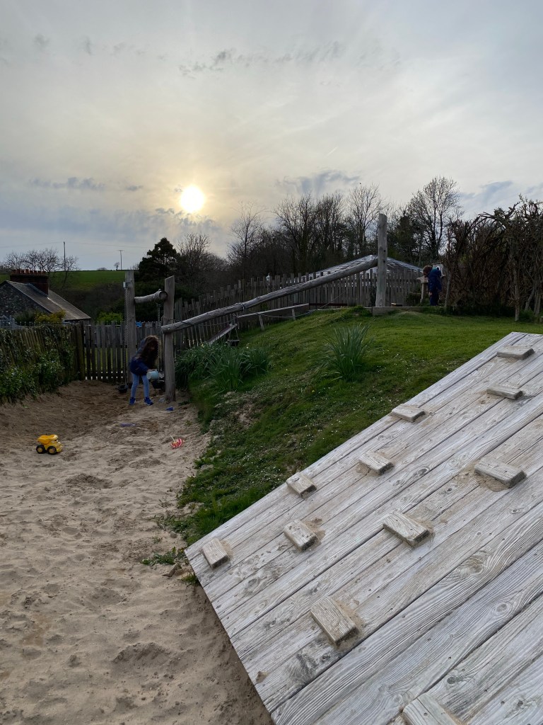 There is a large wooden climbing frame with slide and where you can pull sand up to to send down the chutes.