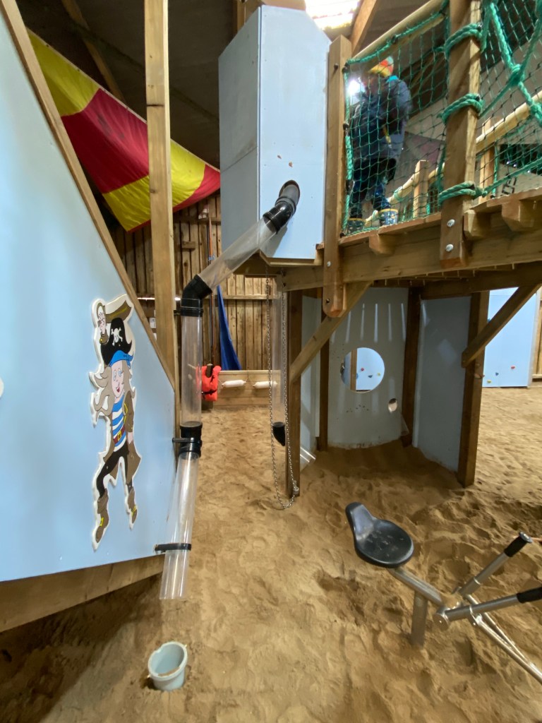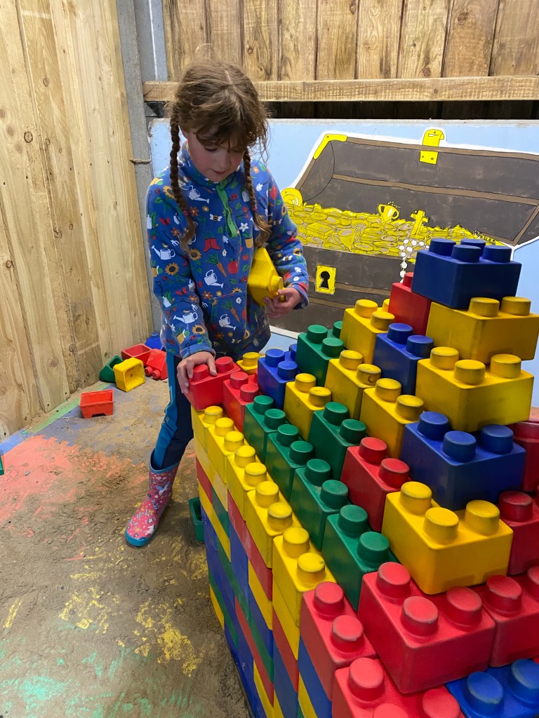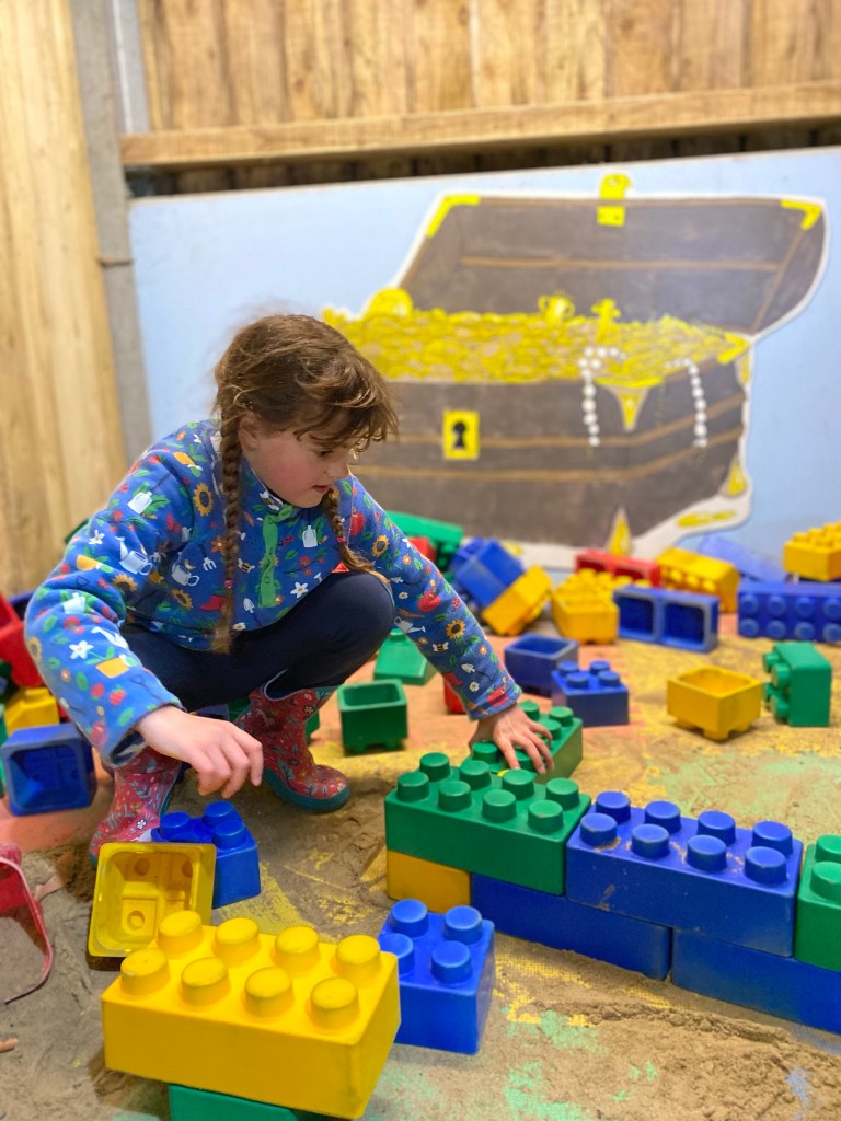 There’s a climbing wall, sand digger, buckets & pulleys (the kids love these!) and huge building bricks.