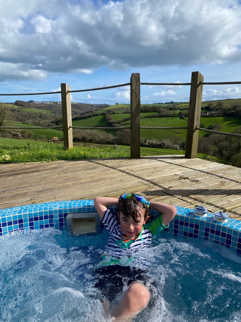 There is a very smart pool room at the pool and spa with changing room, toilet, shower, honesty fridge, seating area for relaxing and even a sauna! The spa is outside on the hillside and has amazing views over the hills towards Looe. Even with two children in the spa with you, it is still extremely relaxing! The spa is always warm, no waiting for it to warm up, remove the cover and just slide in!