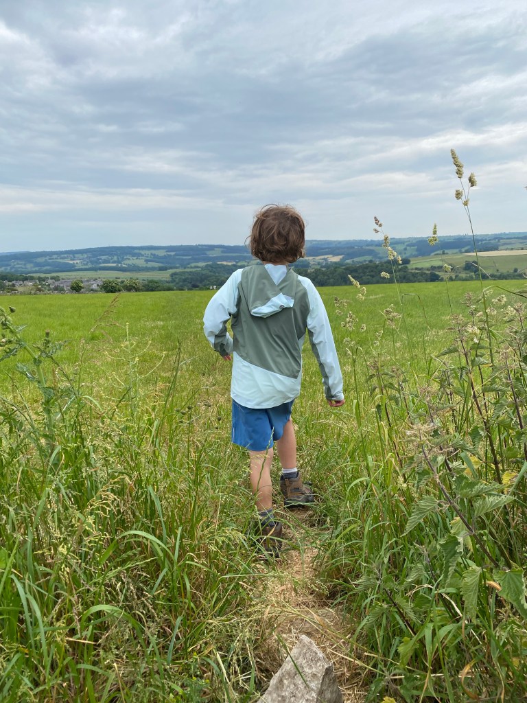 Follow the path over some fields, which were a lovely meadow of long grass when we passed through. The path them cuts through some trees before more field and coming to a road.