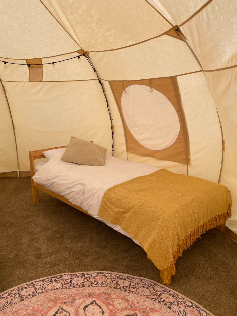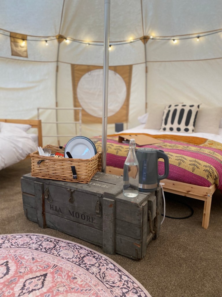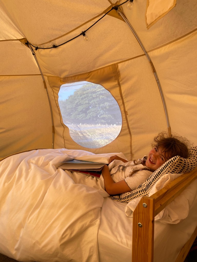 This is camping with more than a hint of luxury. The comfiest beds, the snuggliest duvets, smart cushions and throws, soft carpets, fairy lights, with electric and space to play and relax…..