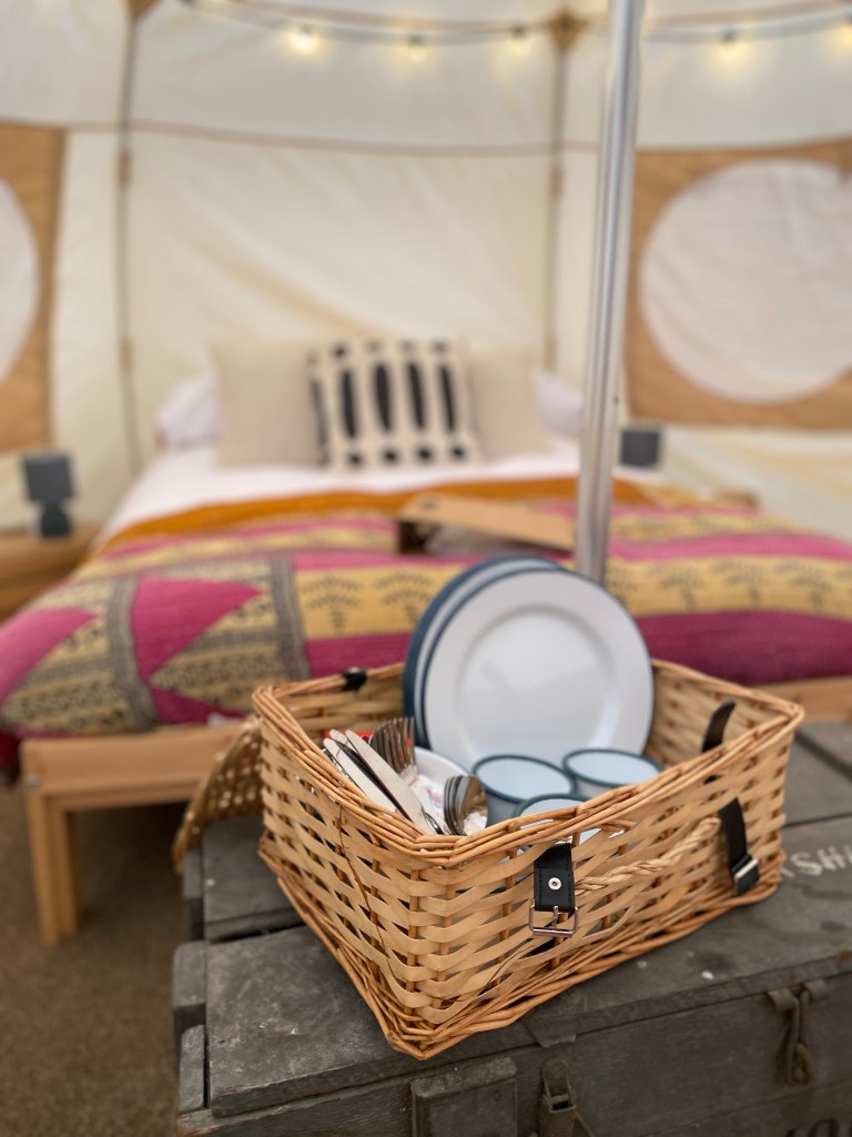 There’s a welcoming basket with coffee and Yorkshire Tea and mugs, bowls, plates and cutlery. With your own kettle to make a cup of tea to enjoy while watching the grasses whispering in the wind.
